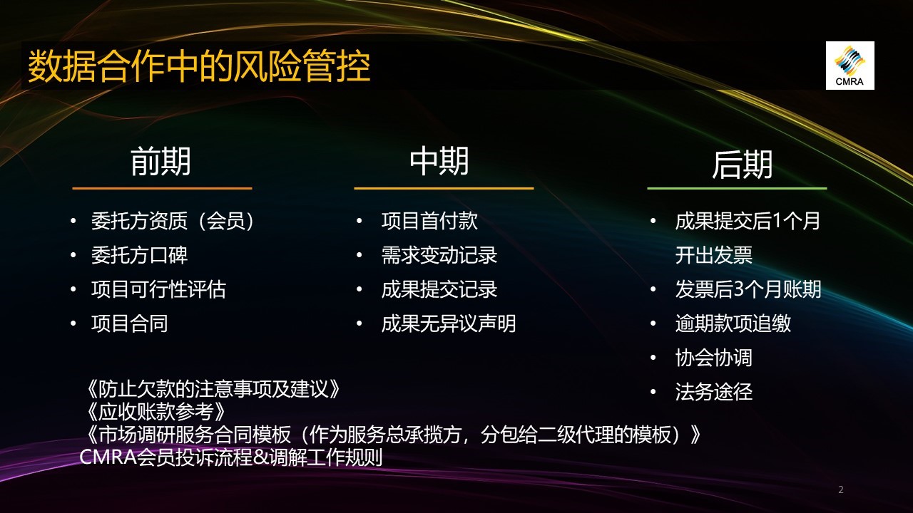 我们把数据合作中的风险管控分为前期、中期、后期来分析。协会经常会接到一些会员的投诉,被欠款、找不到分包公司以及赖帐的事件等等,但这些投诉都是到了后期,这个风险到了后期再想管控很难。所以我们首先建议大家要把精力多放在前期,前期风险控制可以从哪些方面着手呢?第一是看委托方的资质,包括它是不是我们CMRA的会员,如果他不是CMRA的会员,在发生纠纷的时候,我们会员再投诉到协会相关机构这里,其实我们是无能为力的,毕竟协会只能协调自己的会员。第二就是委托方的口碑,大家都有各个业务合作群,当你第一次跟委托方合作的时候可以了解一下对方的口碑怎么样,我们知道现在业内有一些不断更换名字或换马甲的发包公司,其实你了解一下就会发现是换汤不换药。第三就是项目的可行性评估,有一些发包公司发出一个根本不可能实现的目标,这种难度过高的项目大概率是收不到全部回款的。第四个就是项目合同。很多业内公司老板大家都很熟,所以我们很多的数据采集业务都是先做项目,然后补合同再开发票,但是,如果你跟委托方第一次合作要避免这种方式。前一段时间,CMRA权益保障工作委员会和标准委员会协同拟定了一些标准合同,大家可以参考。这些合同已经发布在协会的官方网站上。有很多案例,签了分包合同最后发生纠纷,协会协调无果,最后通过打官司或者其他方式都可以把钱要回来。合同是商业合作控制风险的关键。