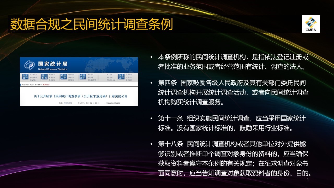 一是《民间统计调查管理条例》,这个条例还在征求意见阶段,征求意见稿发在国家统计局的官方网站,我们根据中国法律进程一般的经验来看,未来发布的正式条例和征求意见稿通常不会有太大的差别。根据条例规定,只要营业执照里面有统计或者是调查的法人机构都会受到这个条例的管理。