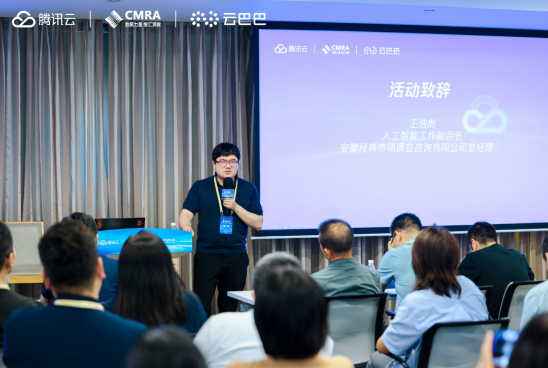 紧接着,CMRA人工智能工作副会长、安徽经典市场调查咨询有限公司总经理王浩然进行了致辞。他一针见血地指出,“人工智能”正是当下市场研究行业破局突围最核心的关键词。他结合自身企业的探索实践,生动描绘了AI技术在市场研究领域的落地场景,为传统调研机构的“数智化转型”打开了全新的思路。